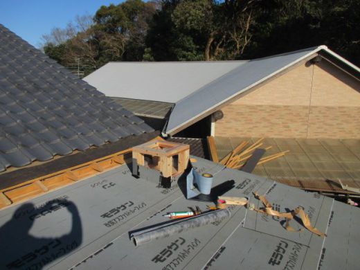 屋根をフラットに収める方法と、架台設置方法の二種類が有りますが、今回は、増築屋根が低くより煙突を高く上げる必要が有り煙突固定強化の為、架台設置方法で施工します。煙突を高く上げる事で火の引きが良く、着火がスムーズである事
